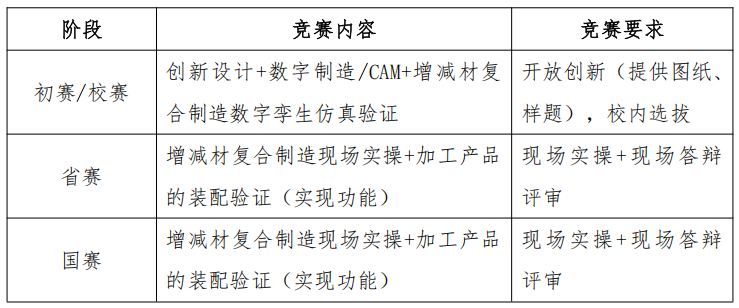 增减材复合制造及数字孪生创新应用专项赛涵盖数字化创新设计、CAM/数智制造、增材制造和桌面式五轴加工数字孪生技术、增材制造设备和桌面式五轴加工中心设备现场实操、产品功能实现等五个环节中的实际工程问题,分为校赛、省赛和国赛三个赛段开展。